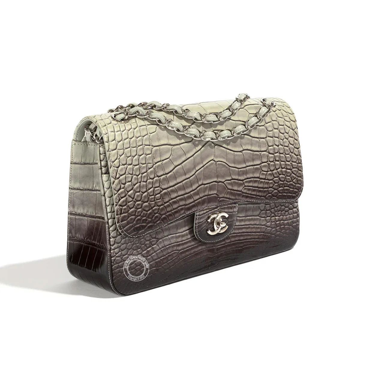 Exquisite Chanel Double Flap Jumbo Grey Ombre Croc Bag with Palladium Hardware - Preloved