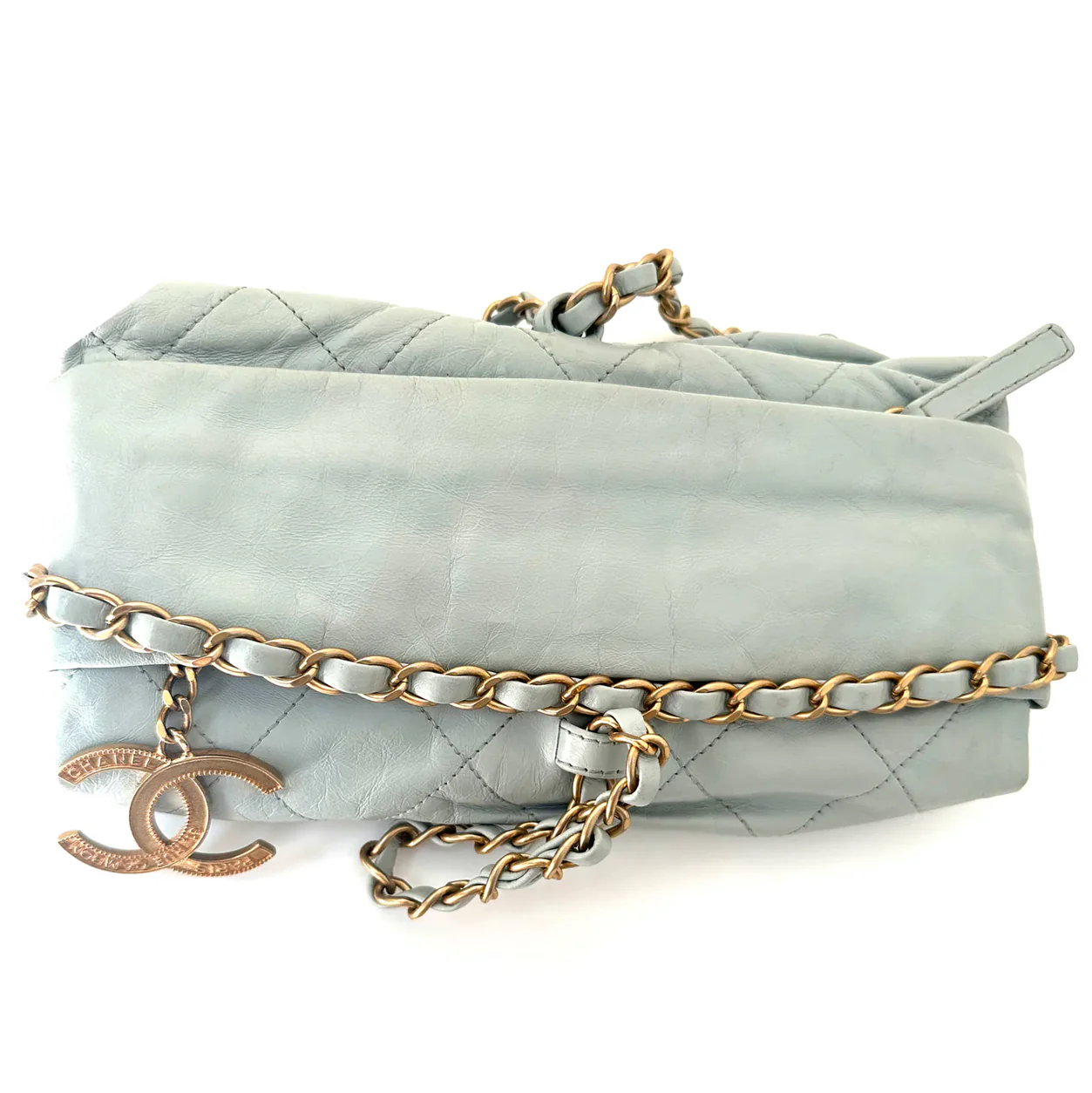 Originating from the coveted 2011/2012 collection, this preloved Chanel bag is a testament to the brand's unparalleled craftsmanship and innovative design. Its gold hardware complements the mint green leather beautifully, creating a harmonious blend of style and elegance.