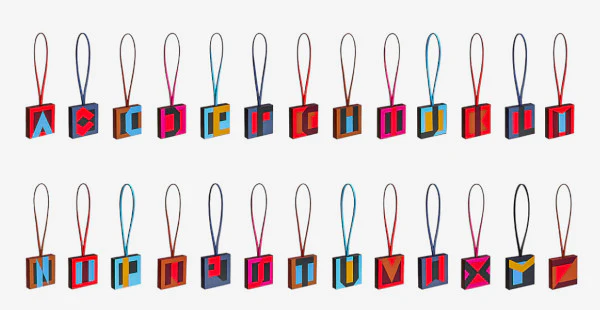 Drawing inspiration from a captivating Art Deco alphabet crafted in the 1930s, this charm shows the letter R in a mix of Bleu Brighton, Bleu Obscur, and Capucine and three different leathers - Epsom, Chevre, and Sombrero.