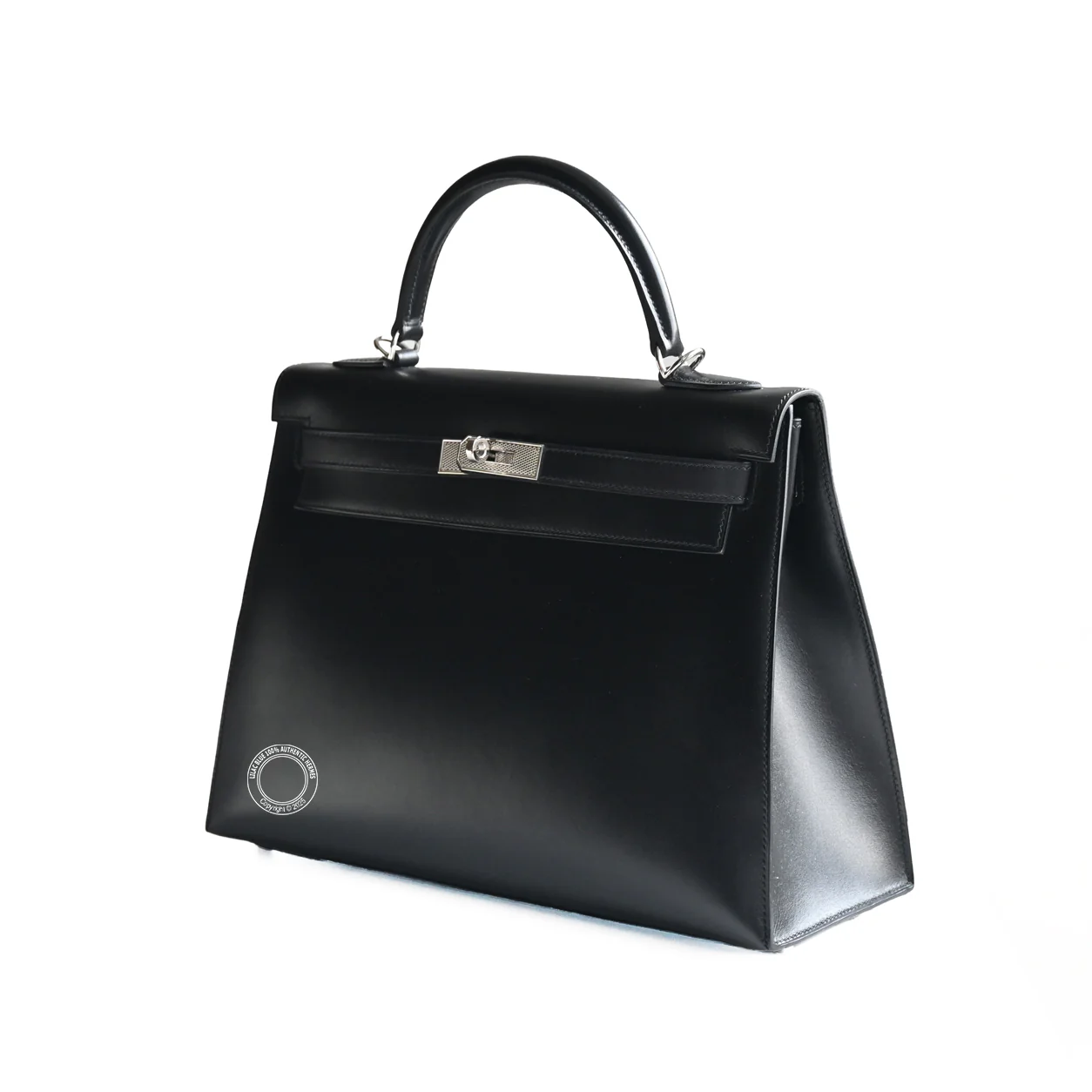 Hermès Kelly 32cm Black Box PHW Guilloche - Preloved